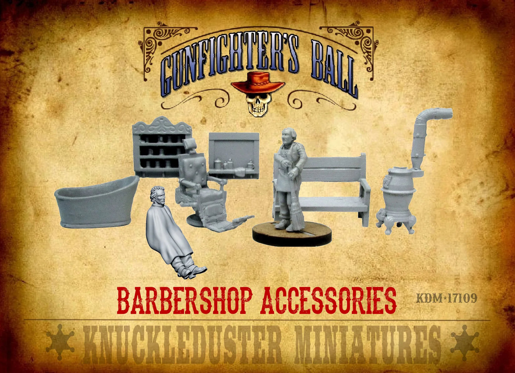The interior gear for a barbershop. Includes: barber, customer, chair, stove, mug rack, mirror/workstation, tub, and waiting bench.