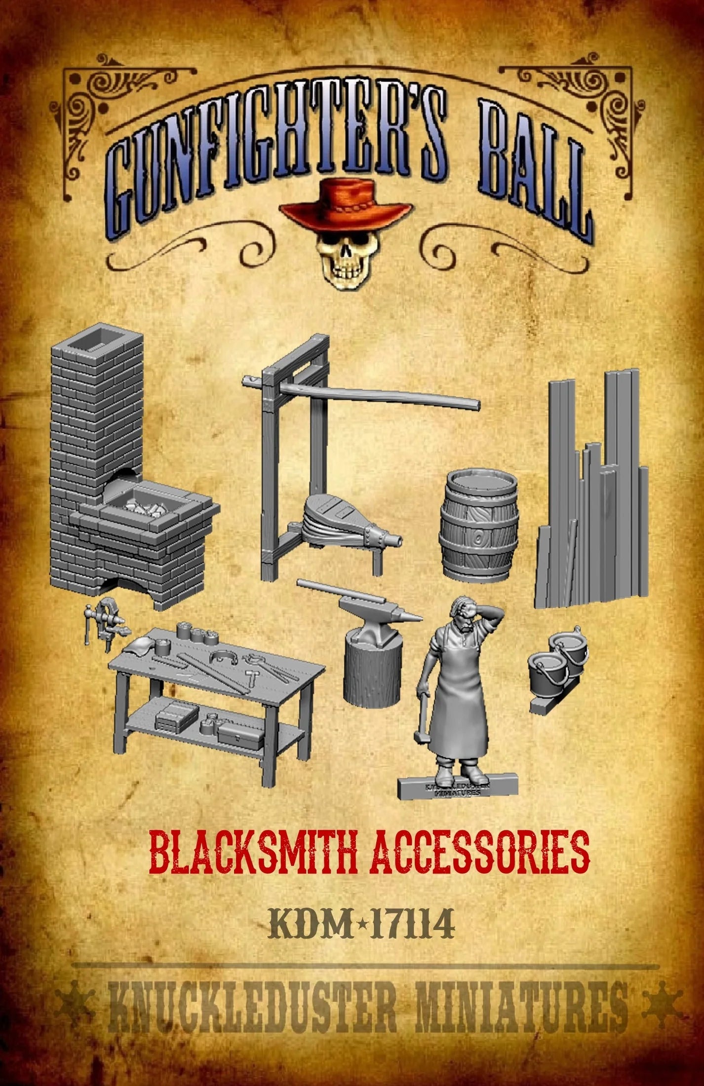 Items for the interior of your 'smitty. Includes a brick forge, bellows, tool bench, quenching barrel, anvil, stack of bar and rod, plus sprues of misc. other equipment.