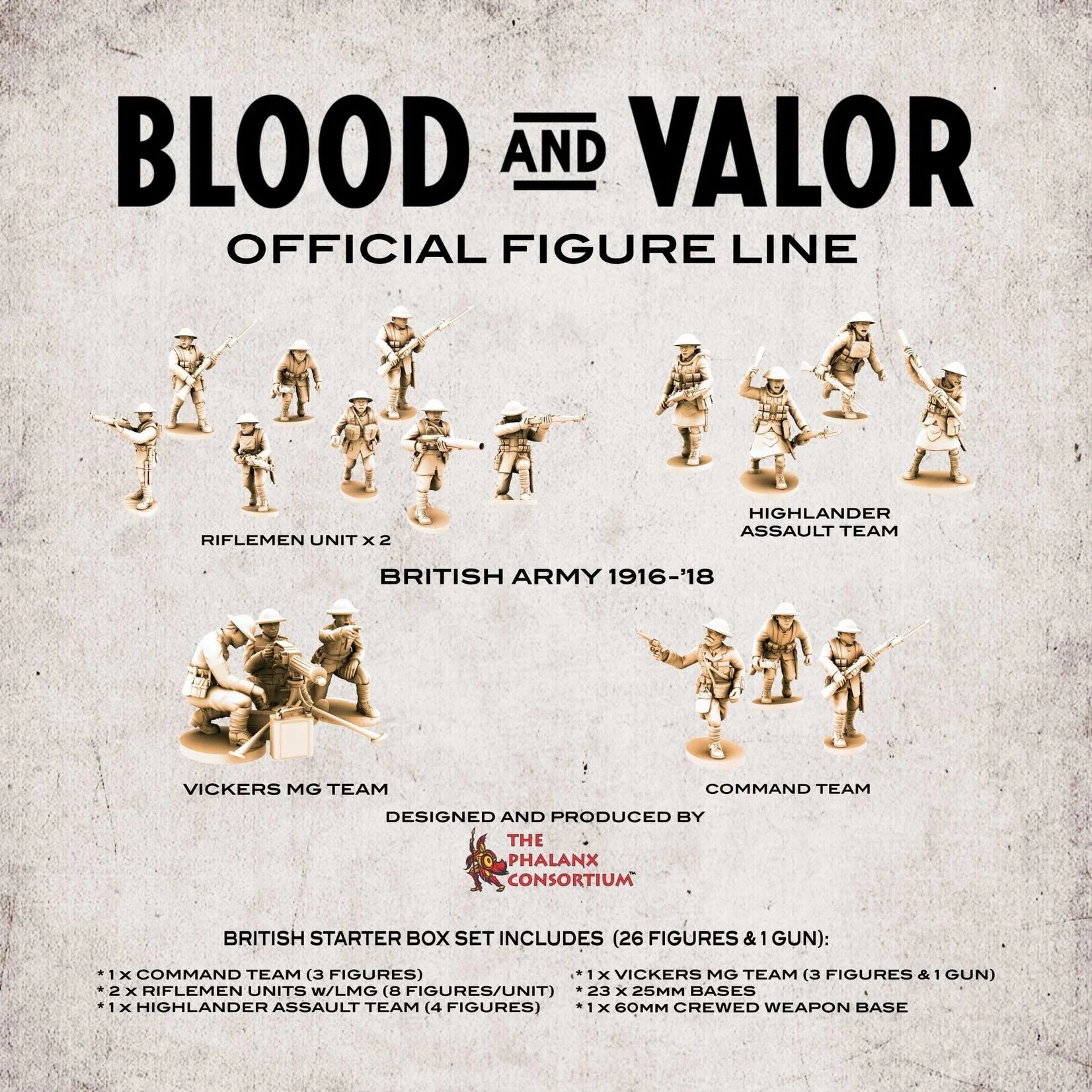 Take to the battlefields of France with this Late War British Army 1916-'18 Starter Box. Designed for use with Firelock Games Blood & Valor WWI Rules. This box set contains a 150pt starter force and contains the following miniatures and accessories: 1x Command Team (3 Figures) 2x Riflemen Units w/LMG (8 figures per unit) 1x Highlander Assault Team (4 figures) 1x Vickers MG Team (3 figures & 1 Gun) 23x 25mm Bases 1x 60mm Crewed Weapon Base British Army Units Stat Card. Figures sized 29mm(foot to eyes) Resin Models