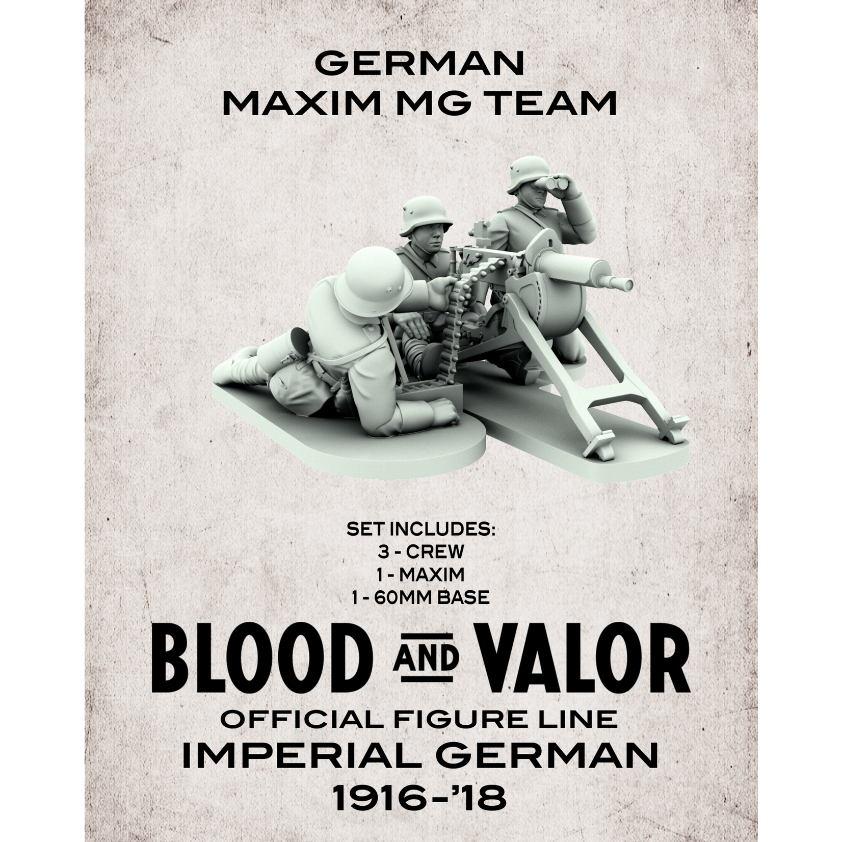 Add more firepower to your force with this Maxim MG Team expansion set. Designed for use with Firelock Games Blood & Valor WWI Rules. Figures sized 29mm(foot to eyes) Resin Models