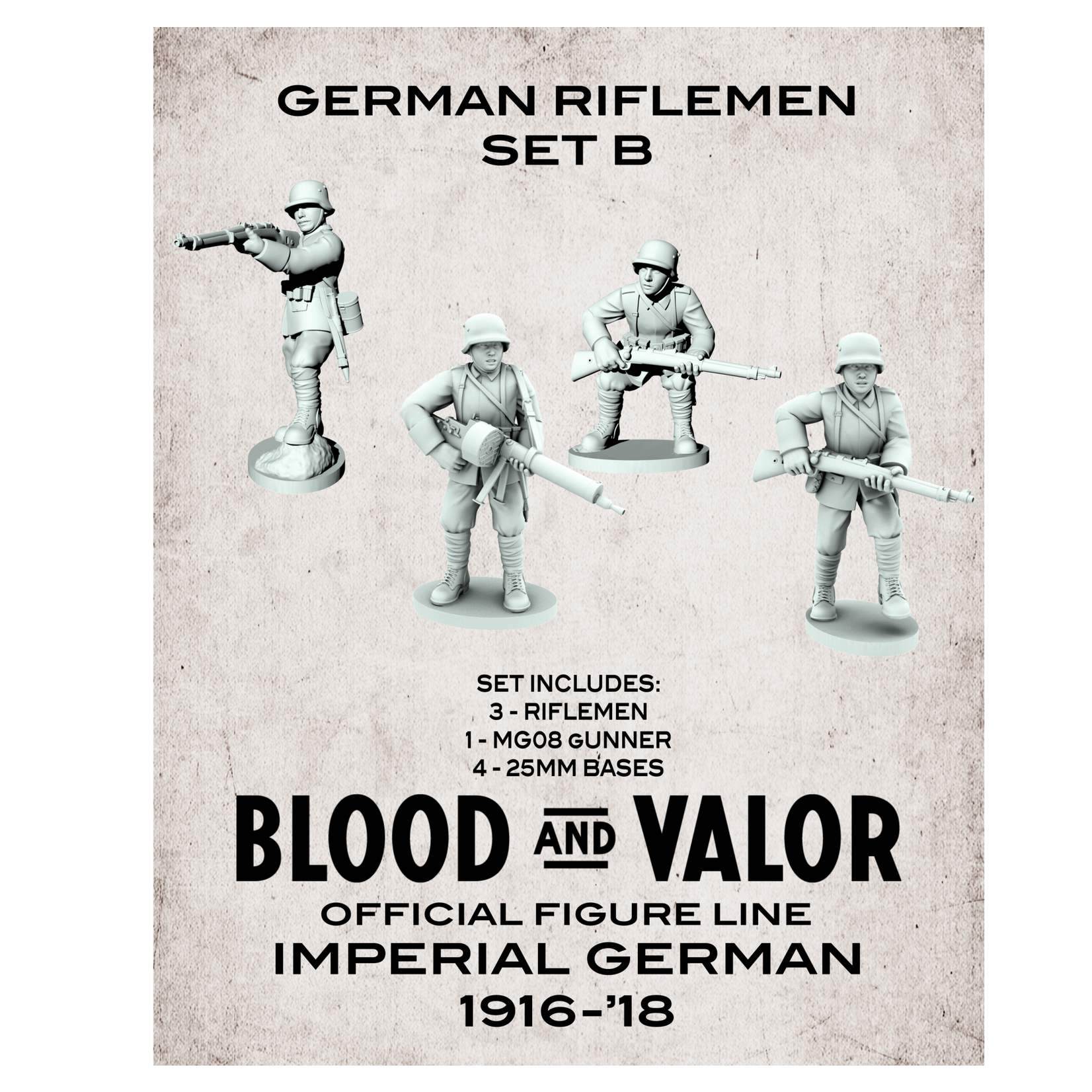 Reinforce your Imperial German Starter Box with this expansion set. Designed for use with Firelock Games Blood & Valor WWI Rules. Figures sized 29mm(foot to eyes) Resin Models