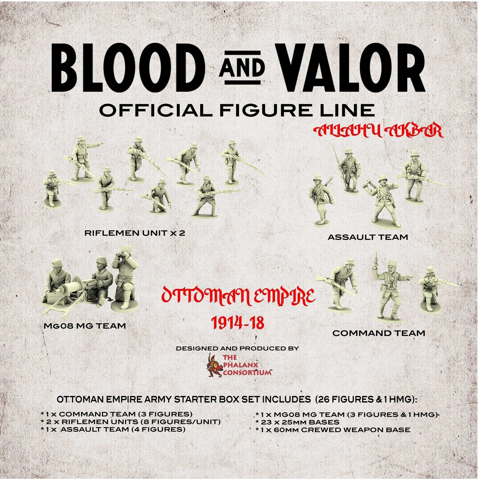 Take to the battlefields of Eastern Europe and the Near East with this Ottoman Empire Army 1914-'18 Starter Box. Designed for use with Firelock Games Blood & Valor WWI Rules.