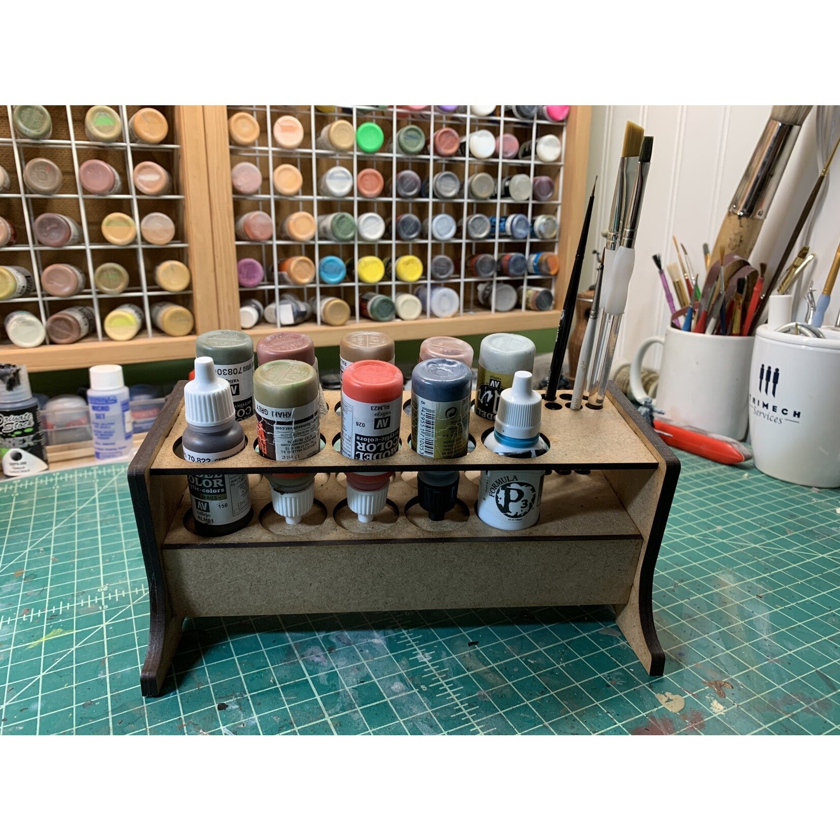 Keep your current project paints organized. This kit contains the parts needed to construct one paint & brush caddy for eyedropper paints such as Vallejo, Army Painter and P3. Caddy holds 10 eyedropper paints, upright or upside down. 6 Brush slots. Assembled caddy stand 4.25"(108.55mm) tall and 8.625"(220.28mm) in length. Parts are laser cut from 3mm HDF. Note: Paints not included, and used to show function . Kit is unpainted.