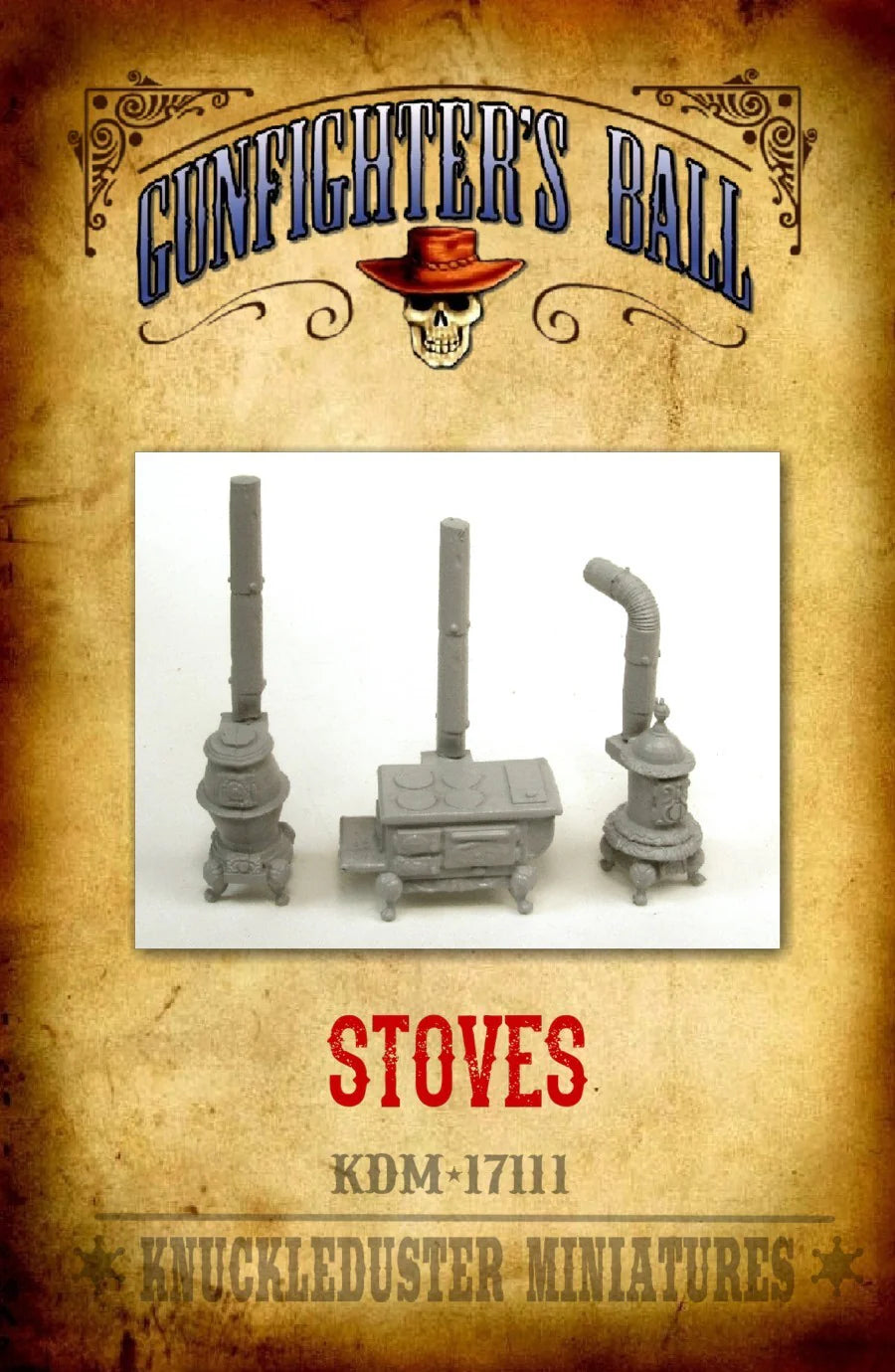 Three stoves with flues attached. Includes a parlor stove, a potbelled stove with burner on top, and a full-sized kitchen stove.