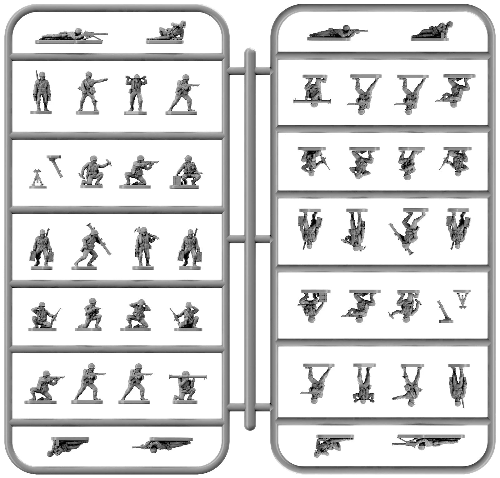 You can field a whole infantry company 1/1 ratio with each set as they contain enough riflemen, light machine guns, mortars, NCO's, radio operators, officers, sergeants and ammo carriers. They are one-piece castings as much as possible but some weapons such as Mortars and heavy Machine guns come in easy assemble multiple parts.