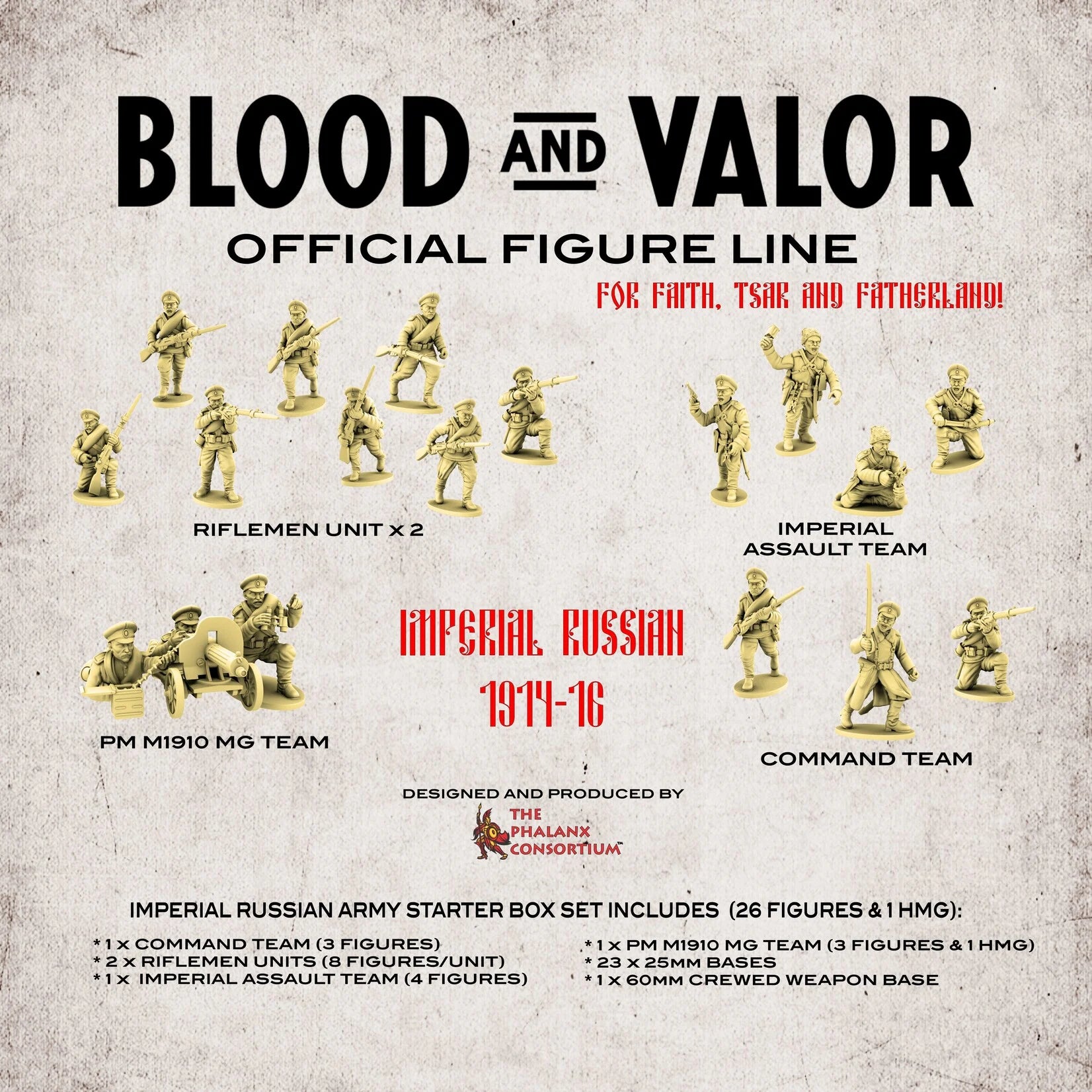 Take to the battlefields of Russian and Eastern Europe with this Imperial Russian Army 1914-'16 Starter Box. Designed for use with Firelock Games Blood & Valor WWI Rules.
